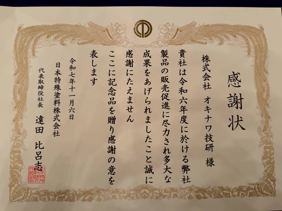 ・2025.11.6 令和7年(第42回)ニットク・アメニティーシステム連合会通常総会にて日本特殊塗料㈱より社長賞を頂きました。